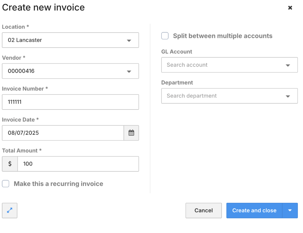 - Click Create and Close or click the dropdown to jump to the invoice.