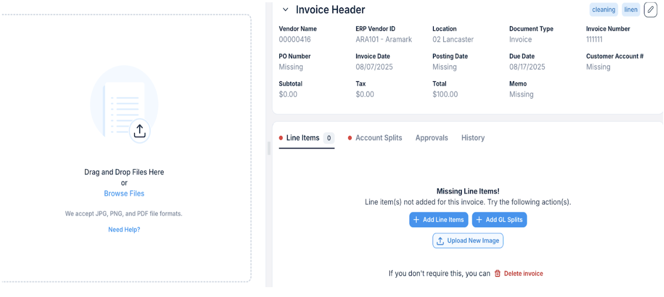 6. The new invoice will appear in the Pending Approval or Approved tab, depending on your user permissions.