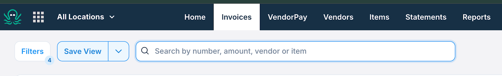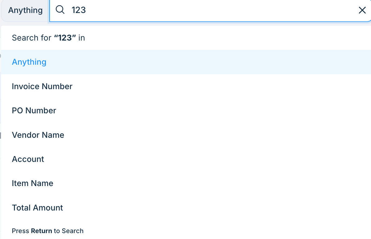 To search for an invoice, enter the invoice number, vendor name, amount, or item name in the search box at the top of the Invoices screen: