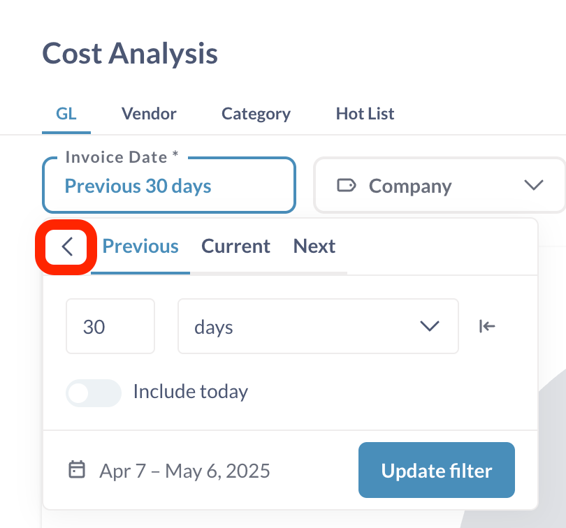Filters let you focus the Cost Analysis Dashboard on a specific location, GL, vendor, category, and/or timeframe. Set these filters by using the filters under the header.