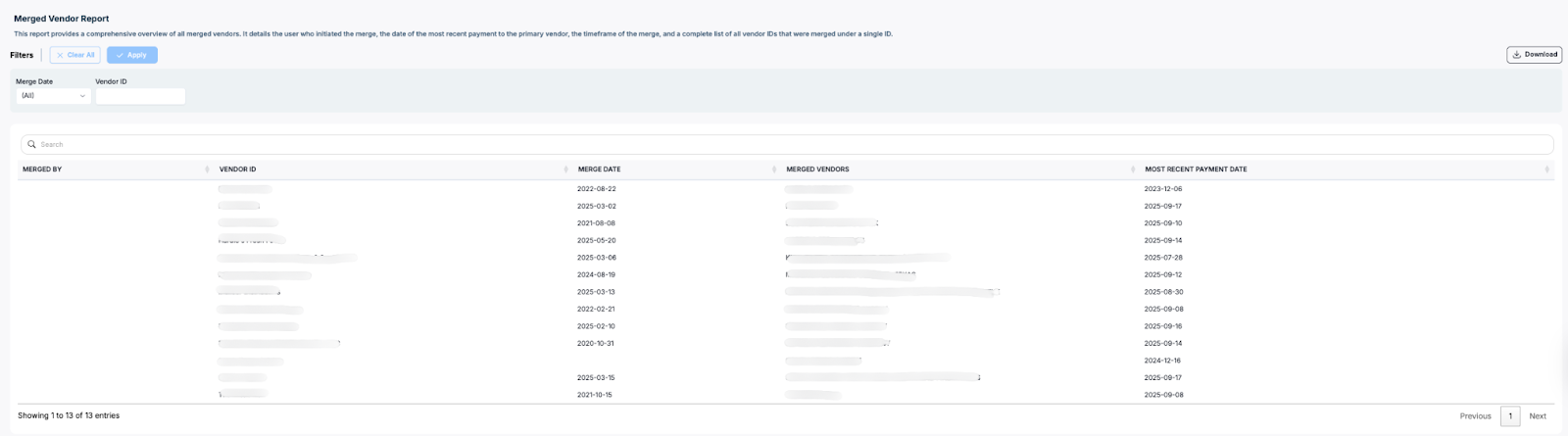 The Merged Vendor Report provides a comprehensive summary of all merged vendors within your organization. This report details the user who performed each merge, the timeframe of each merge, all relevant vendor IDs consolidated under a single record, and the most recent payment date for the primary (merged) vendor. The report offers improved transparency and auditability over historical and current vendor management actions.
