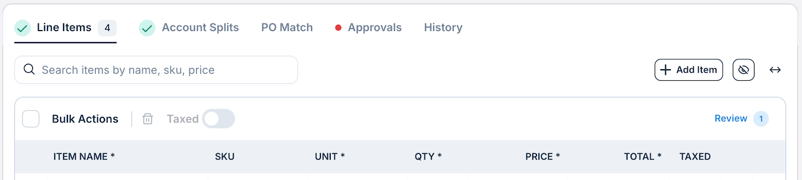 A “Review” badge on invoices with unusual coding